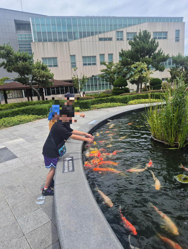 한여름 더운 날씨에도 아이들은 땀도 잊고 한참 동안 잉어와 놀았어요.