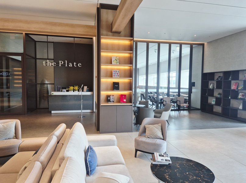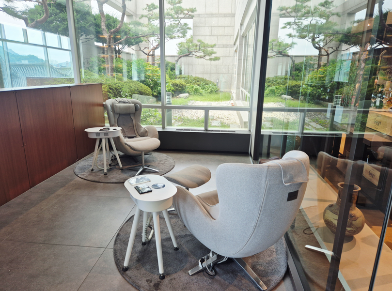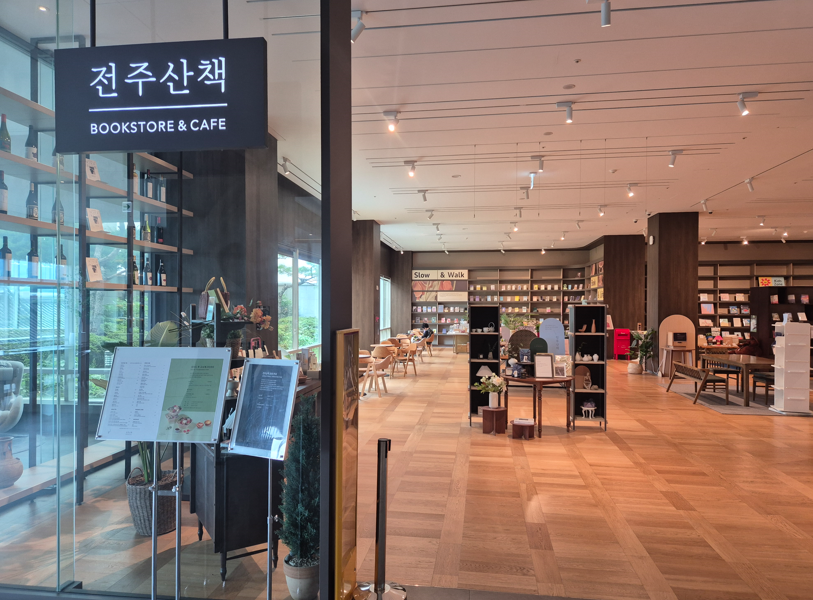 로비 한쪽에는 전주산책(Bookstore & Cafe), 조식 레스토랑 The Plate, 그리고 편하게 쉴 수 있는 안마의자 공간이 마련되어 있어요.