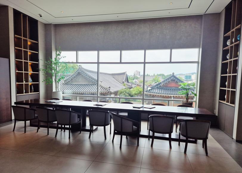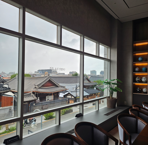 로비 창가 자리에서는 한옥마을 전경을 바라보며 앉아 쉴 수 있는 공간이 있어, 여행 중 잠시 휴식을 취하기에 정말 좋았습니다. ☕