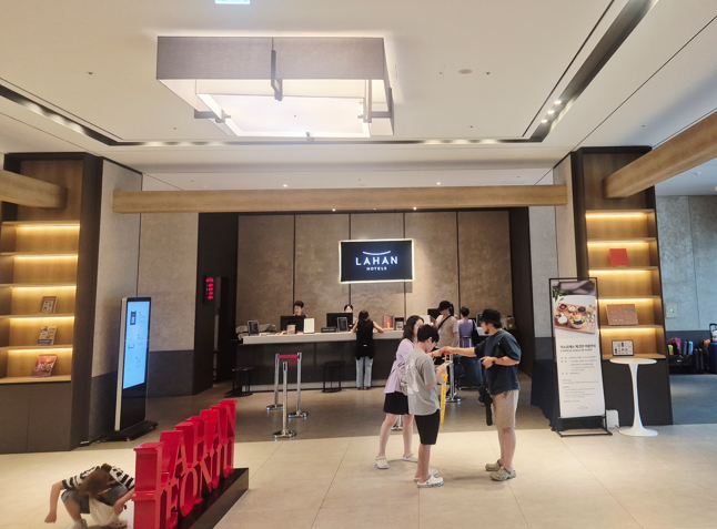 호텔에 들어서면 가장 먼저 로비에 위치한 프런트 데스크와 함께 라한 로고 오브제가 반갑게 맞이합니다.