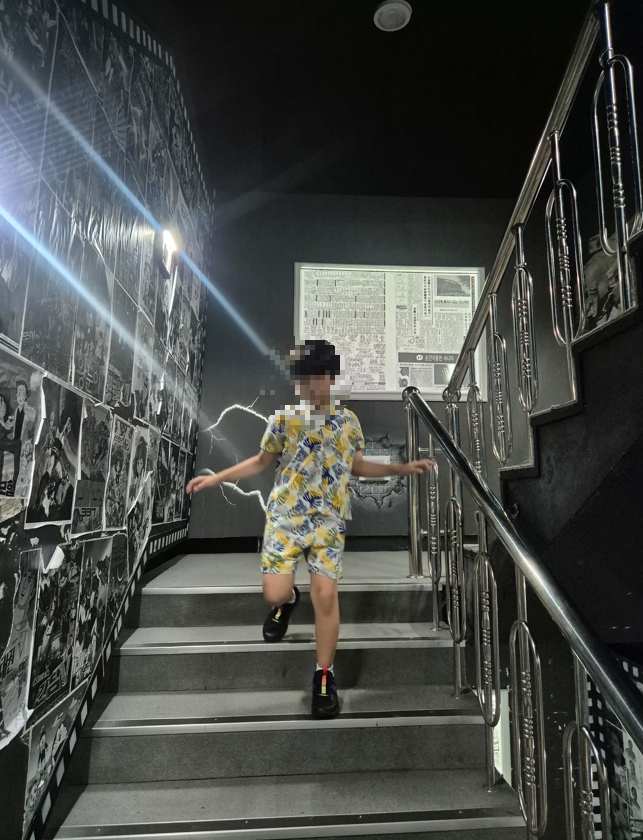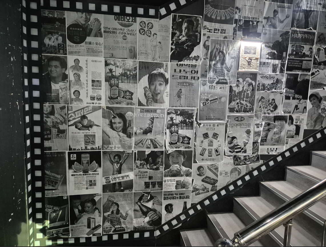 1층에는 노형다방, 기념품 샾이 있고, 1층에서 2층으로 올라가는 계단에 옛날 과자, 만화 광고 포스터가 붙어 있습니다.