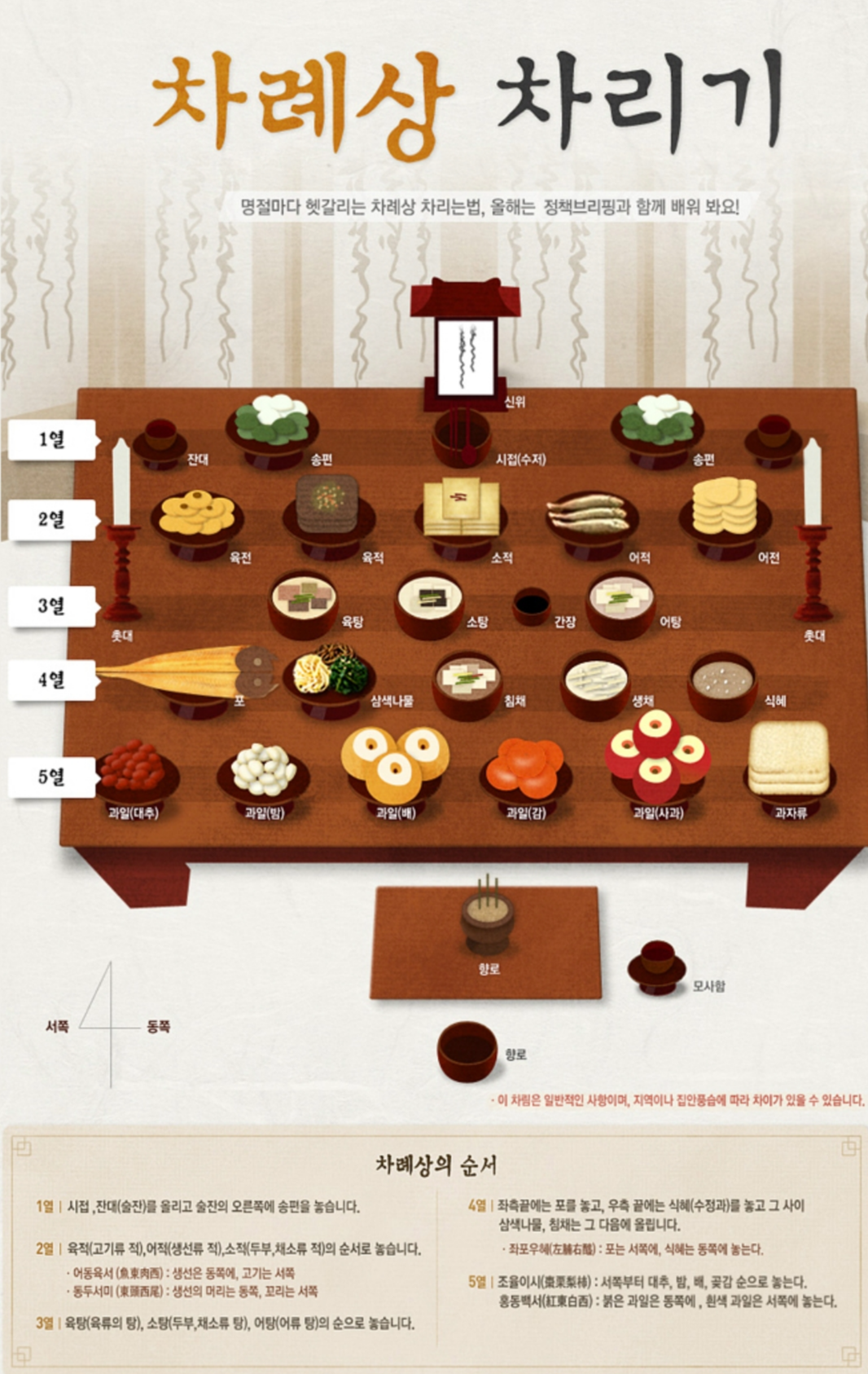 | 5열 | 앞줄 | 과일, 과자류 | 조율이시 원칙(대추·밤·배·감) 순서로 배치 |