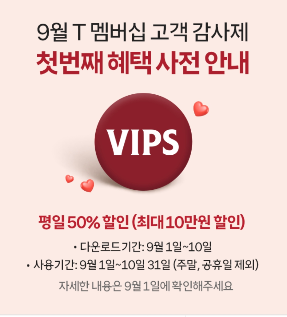 VIPS | 최대 50% | 9/1 ~ | T멤버십 고객 대상 |