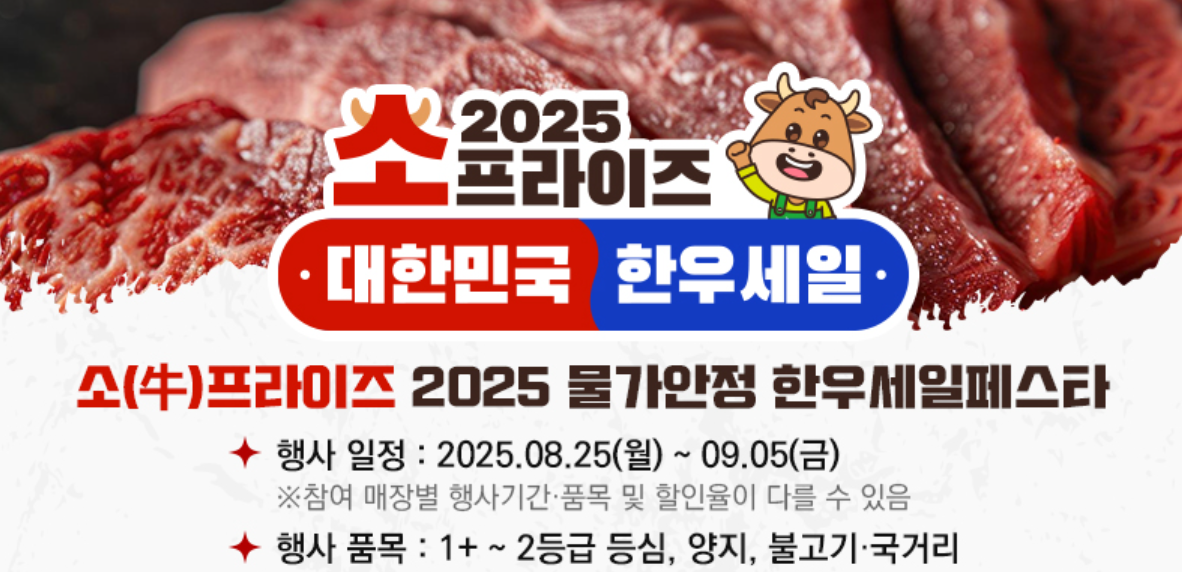 2025년 8월 25일(월)부터 9월 5일(금)까지 단 12일간 진행되는 ‘소프라이즈 한우세일페스타’는 전국적인 한우 할인 행사입니다. 도축 두수 증가로 인한 가격 하락을 선제적으로 반영한 행사로, 평소엔 부담됐던 1+등급 한우까지도 반값 수준으로 구입할 수 있는 절호의 기회예요! 😊